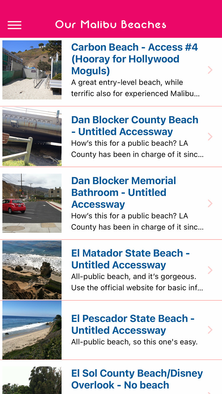 A phone app, with all the info you need (a lot!) to find & enjoy the stunning 20 miles of Malibu beaches that are lined with private development—where the accessways are, where the dry-sand public easements are, where to park (join the volunteer Orange Cone Relocation Squad if you wish), & which signs you can smile at and ignore.